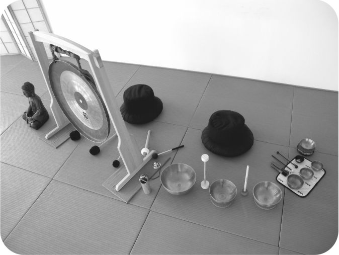 Bei einer Klangmeditation auf einer Matte liegend wirken die Klangwellen primär über den akustischen Reiz. Es können auch weitere Klanginstrumente wie z. B. die Zimbel, das Koshi oder Zen Klangschalen eingesetzt werden. Die Klangwellen umhüllen den Teilnehmer wie eine Art Schutzmantel und sorgen für Sicherheit. Auf dieser Grundlage ist eine Tiefenentspannung möglich, die teilweise noch Stunden oder Tage nach der Anwendung ihre nachhaltige Wirkung entfaltet. Sie gibt dem Teilnehmer die Möglichkeit, mit neuer Kraft und Kreativität zurück in den Alltag zu finden. Bei einer Gong Klangmeditation kommen mehrere Gongs zum Einsatz. Ein Klangteppich führt in die Stille. Für Menschen mit normaler physischen & psychischen Gesundheit.